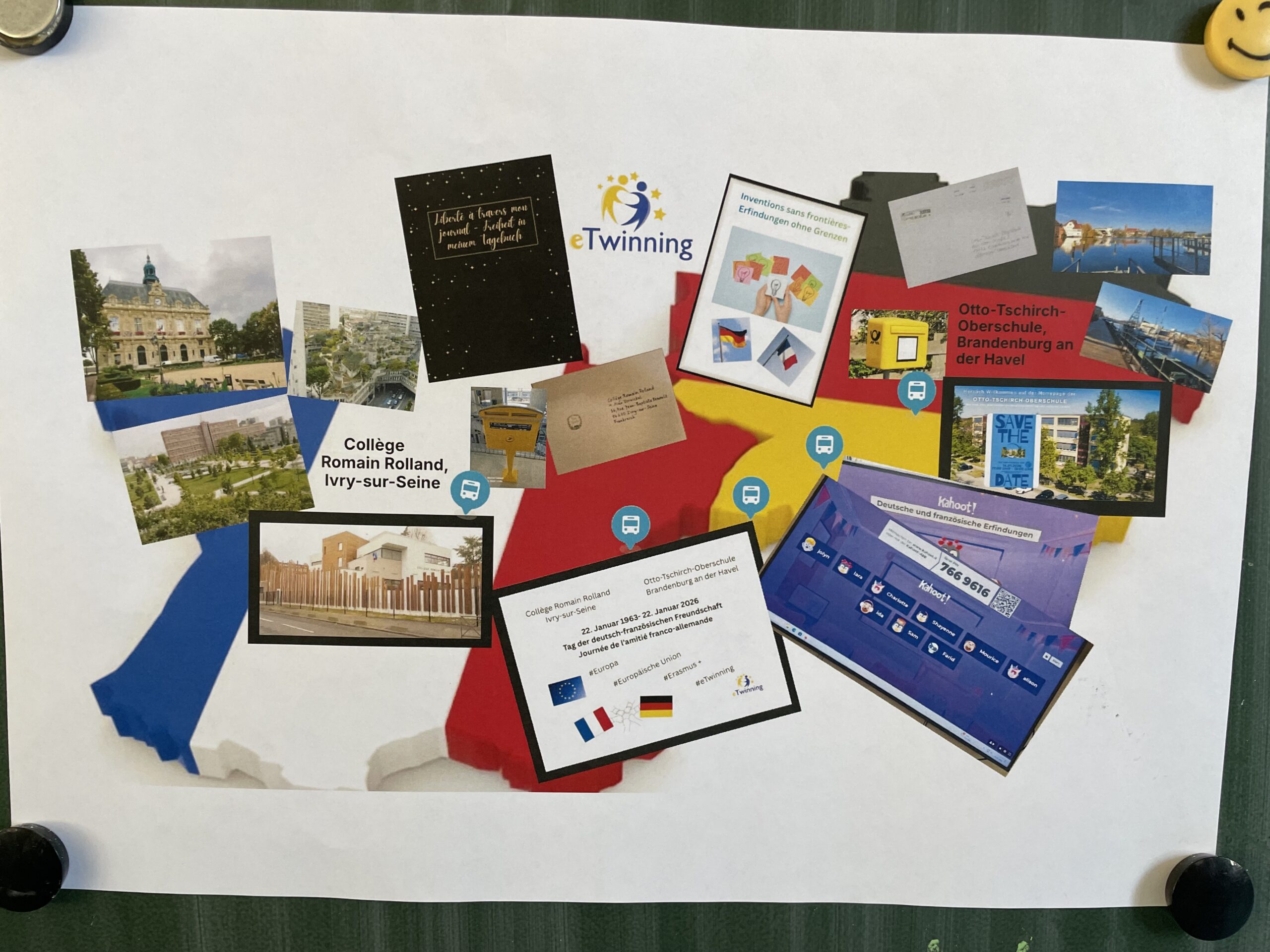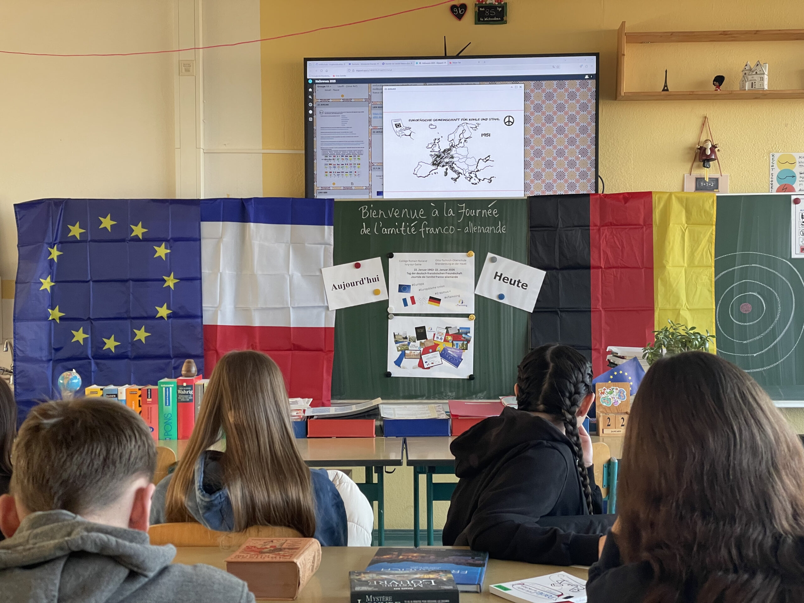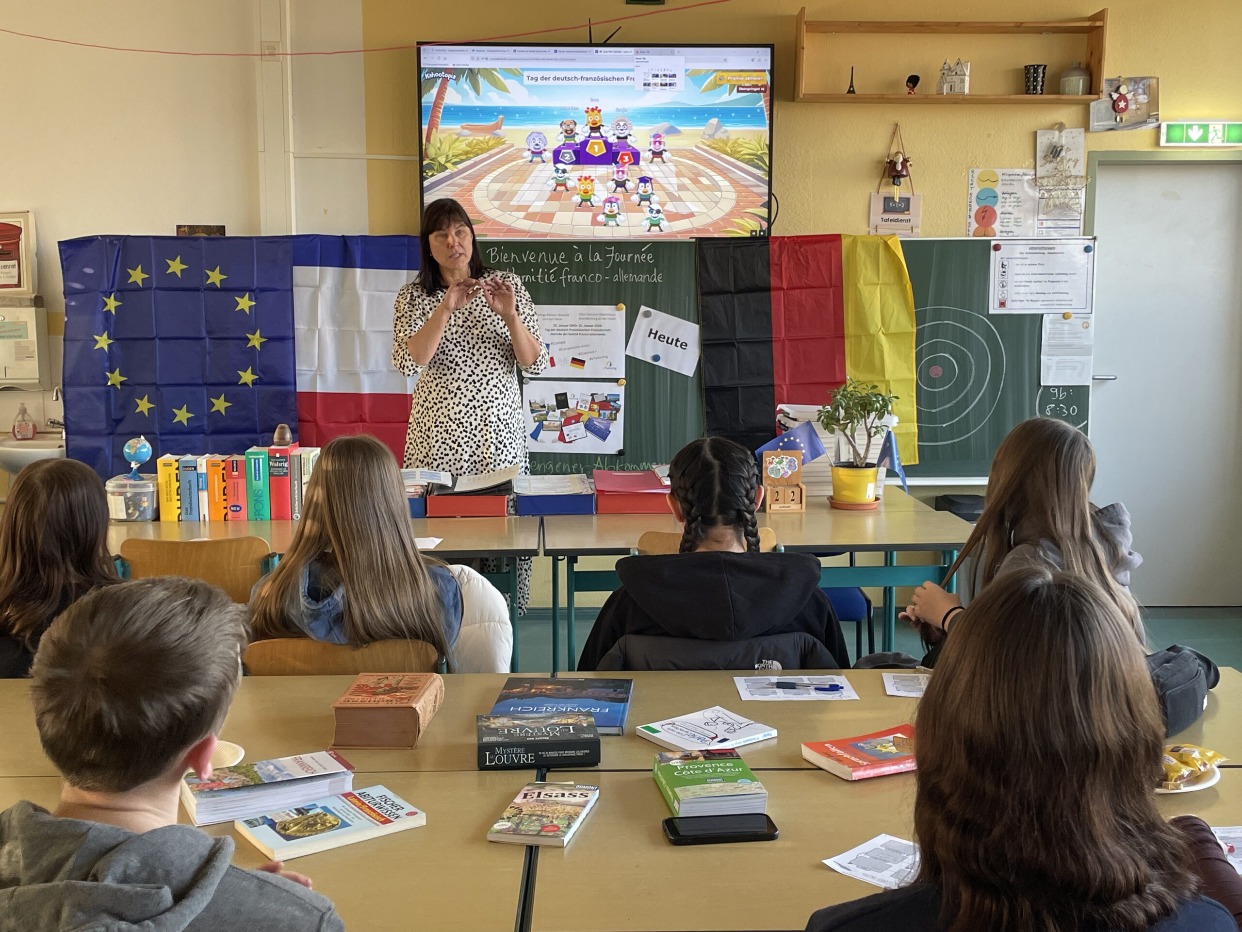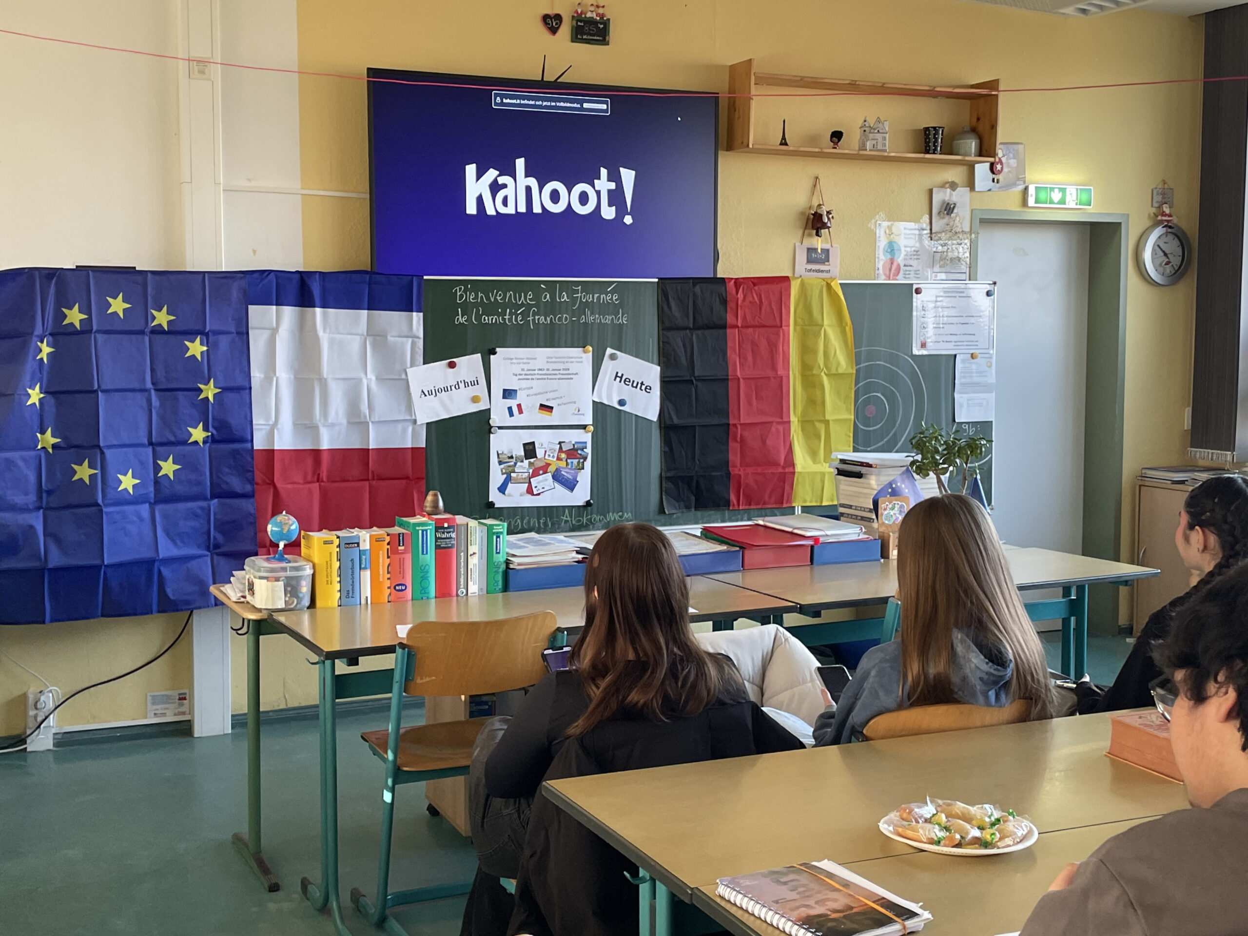 Im Rahmen eines Projekttages organisierte Französischlehrerin Ute Hennig gemeinsam mit dem französischen Deutschlehrer Alan Zernickel ein bilinguales Quiz, das als interaktives Kahoot durchgeführt wurde. Die Schülerinnen und Schüler beantworteten dabei Fragen zur Geschichte der deutsch-französischen Beziehungen, die zuvor im Unterricht behandelt worden war, sowie zu gemeinsamen Institutionen wie dem Deutsch-Französischen Jugendwerk (DFJW/OFAJ) oder dem Kultursender ARTE. Ergänzt wurde der Projekttag durch typisch französische Snacks, darunter Madeleines, die für eine authentische und lockere Atmosphäre sorgten.